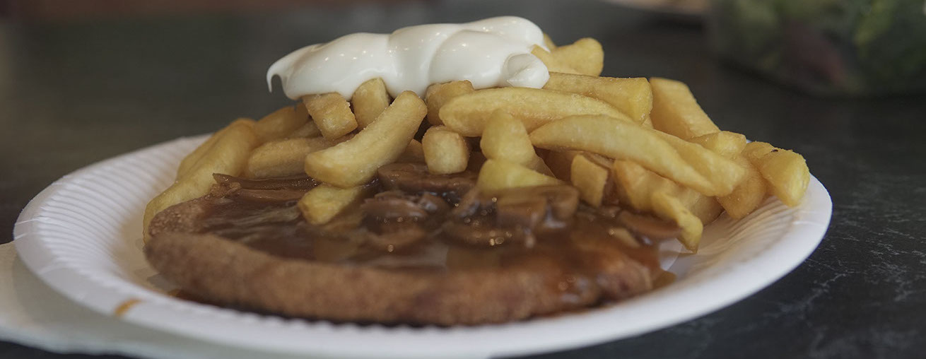 Jäger-Zigeunerschnitzel mit Pommes Mayo od. Ketchup